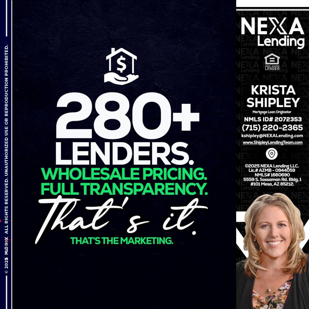 Hi, my name is Krista Shipley. I’m a Loan Officer with NEXA Mortgage LLC., offering personalized mortgage solutions, fast customized quotes, great rates and service with integrity.