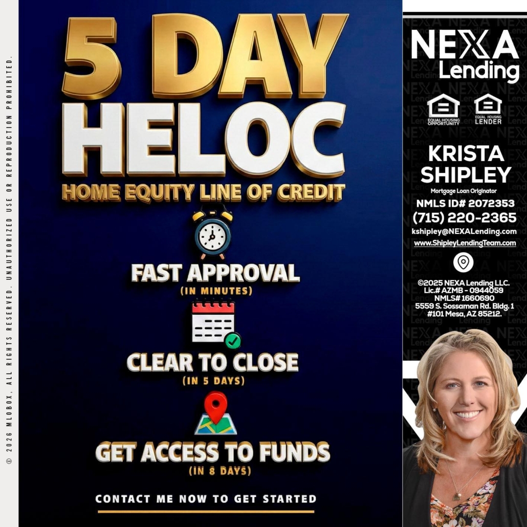 5 day hello - Krista Shipley -Mortgage Loan OriginatorHi, my name is Krista Shipley. I’m a Loan Officer with NEXA Lending LLC., offering personalized mortgage solutions, fast customized quotes, great rates and service with integrity.