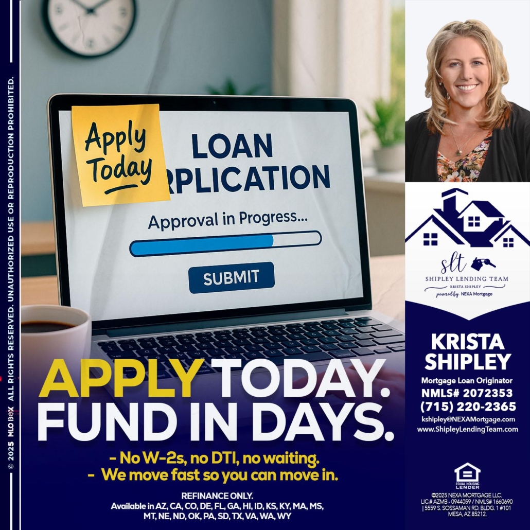 Hi, my name is Krista Shipley. I’m a Loan Officer with NEXA Mortgage LLC., offering personalized mortgage solutions, fast customized quotes, great rates and service with integrity.
