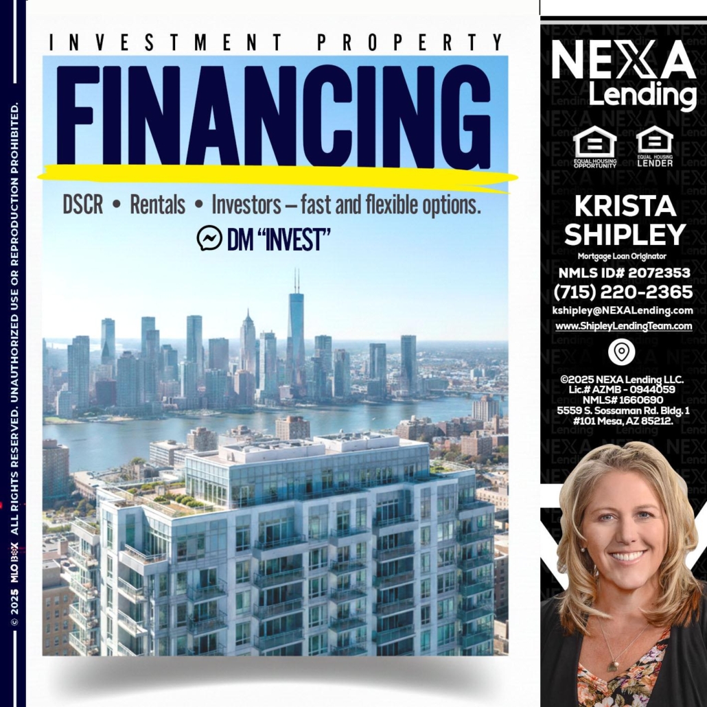 FINANCING - Krista Shipley -Mortgage Loan OriginatorHi, my name is Krista Shipley. I’m a Loan Officer with NEXA Lending LLC., offering personalized mortgage solutions, fast customized quotes, great rates and service with integrity.