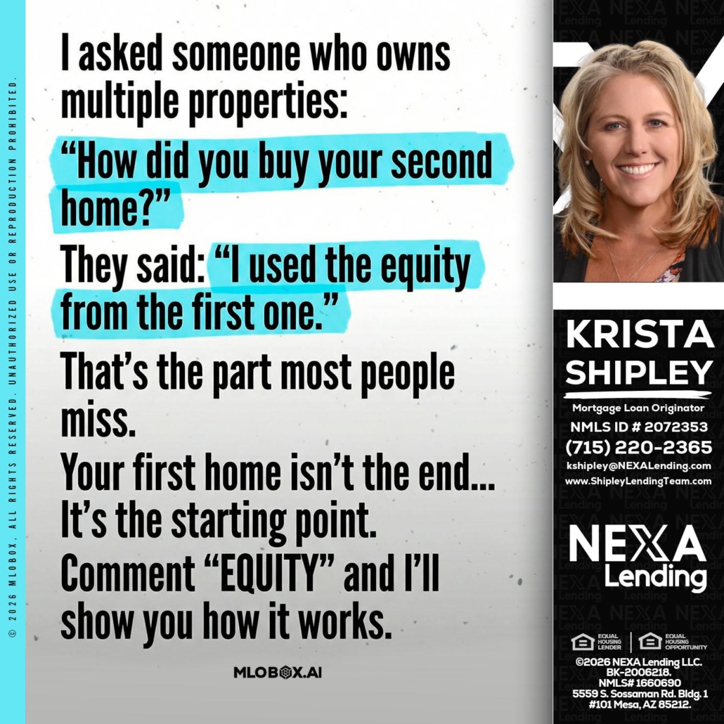 I asked someone - Krista Shipley -Mortgage Loan OriginatorHi, my name is Krista Shipley. I’m a Loan Officer with NEXA Lending LLC., offering personalized mortgage solutions, fast customized quotes, great rates and service with integrity.
