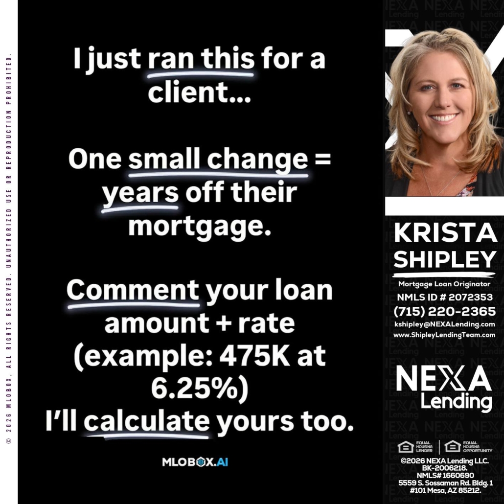 Hi, my name is Krista Shipley. I’m a Loan Officer with NEXA Lending LLC., offering personalized mortgage solutions, fast customized quotes, great rates and service with integrity.