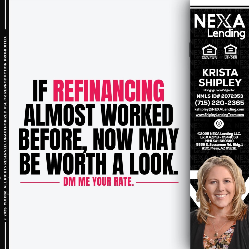 Hi, my name is Krista Shipley. I’m a Loan Officer with NEXA Lending LLC., offering personalized mortgage solutions, fast customized quotes, great rates and service with integrity.