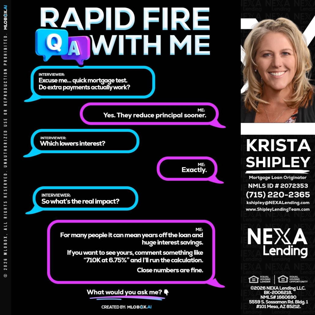 Hi, my name is Krista Shipley. I’m a Loan Officer with NEXA Lending LLC., offering personalized mortgage solutions, fast customized quotes, great rates and service with integrity.