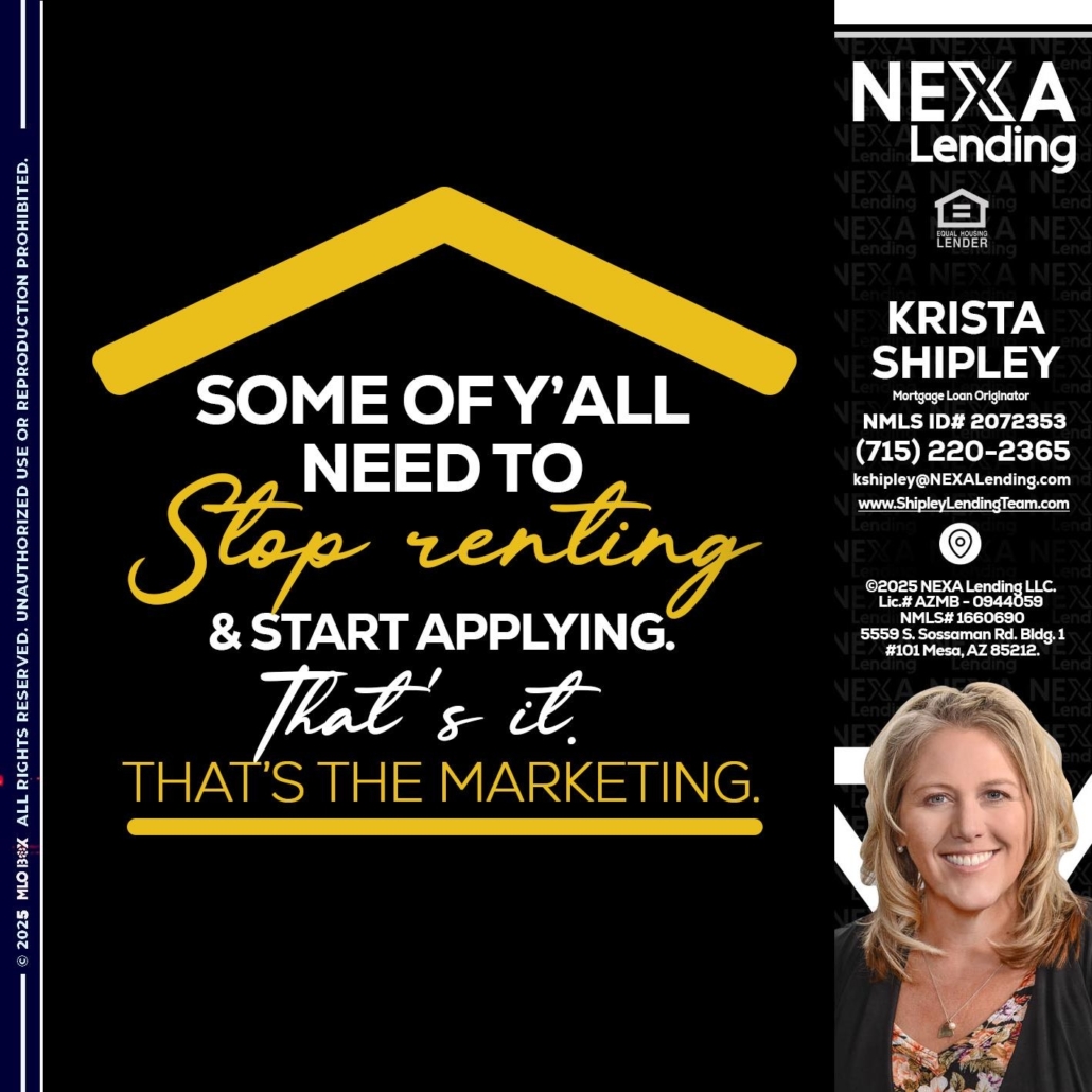 Hi, my name is Krista Shipley. I’m a Loan Officer with NEXA Mortgage LLC., offering personalized mortgage solutions, fast customized quotes, great rates and service with integrity.